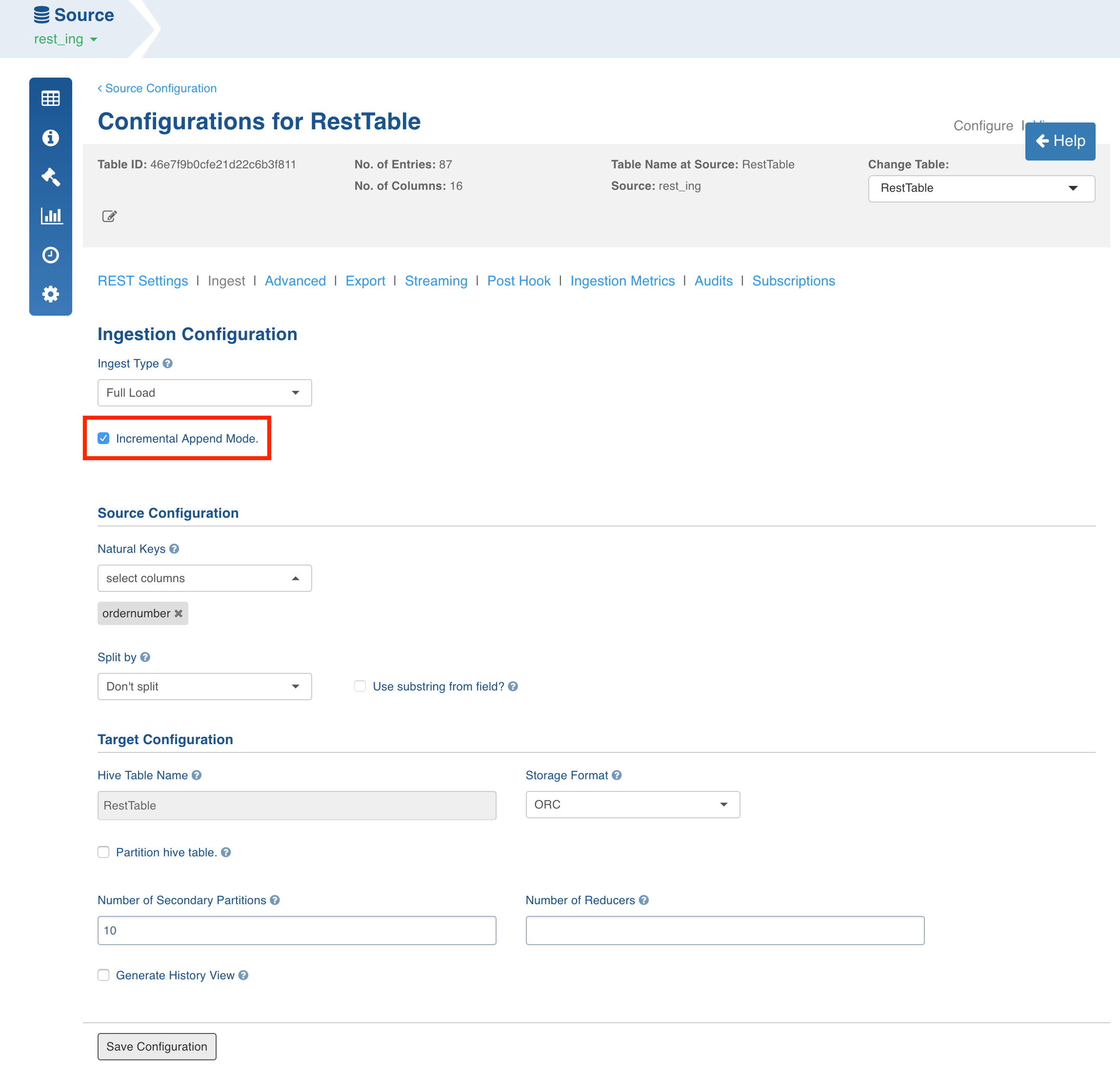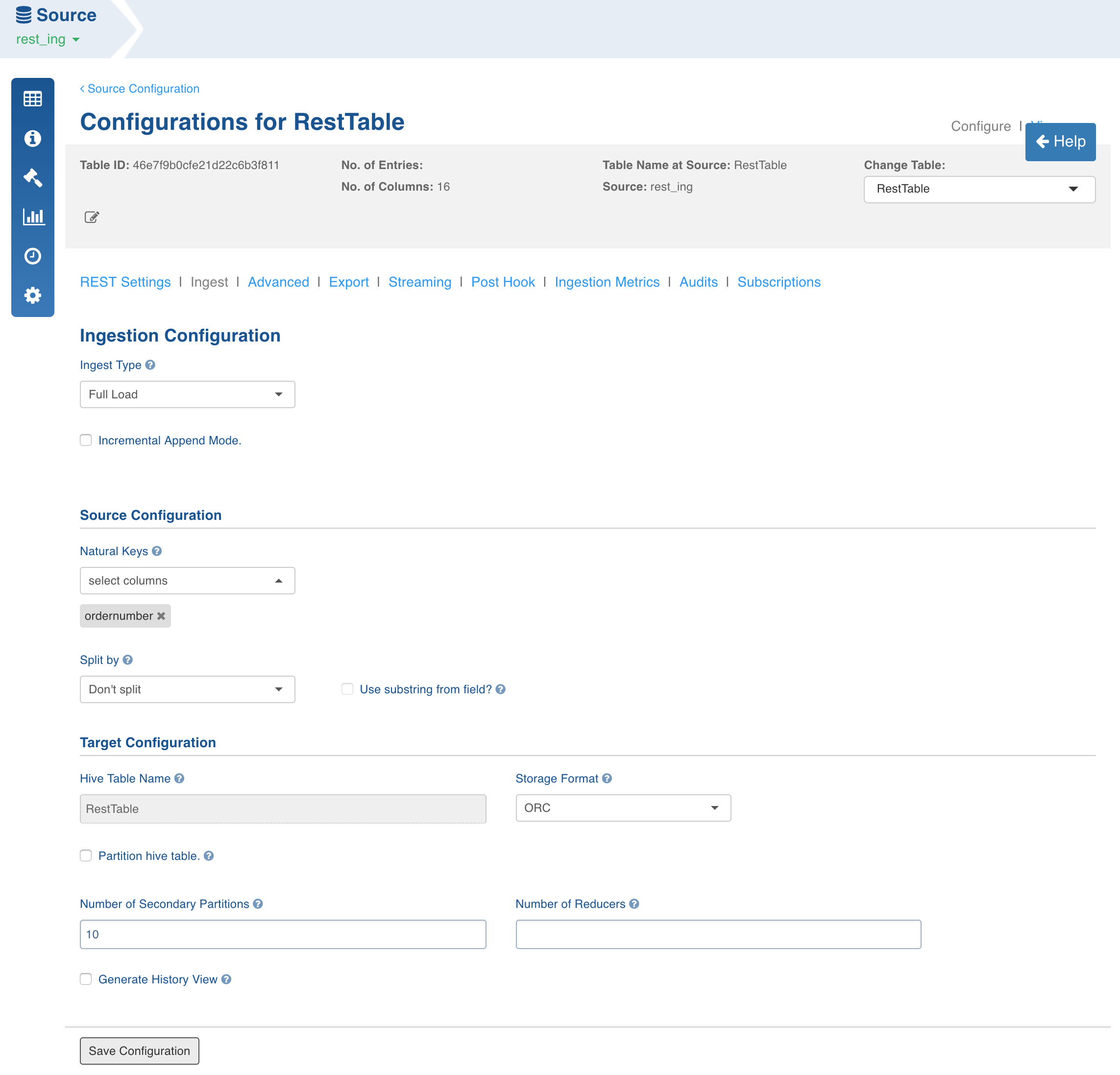 - Select the Ingest Type as Full Load, enter the required values and click Save Configuration. For descriptions of fields, see Source Table Configuration Field Descriptions.