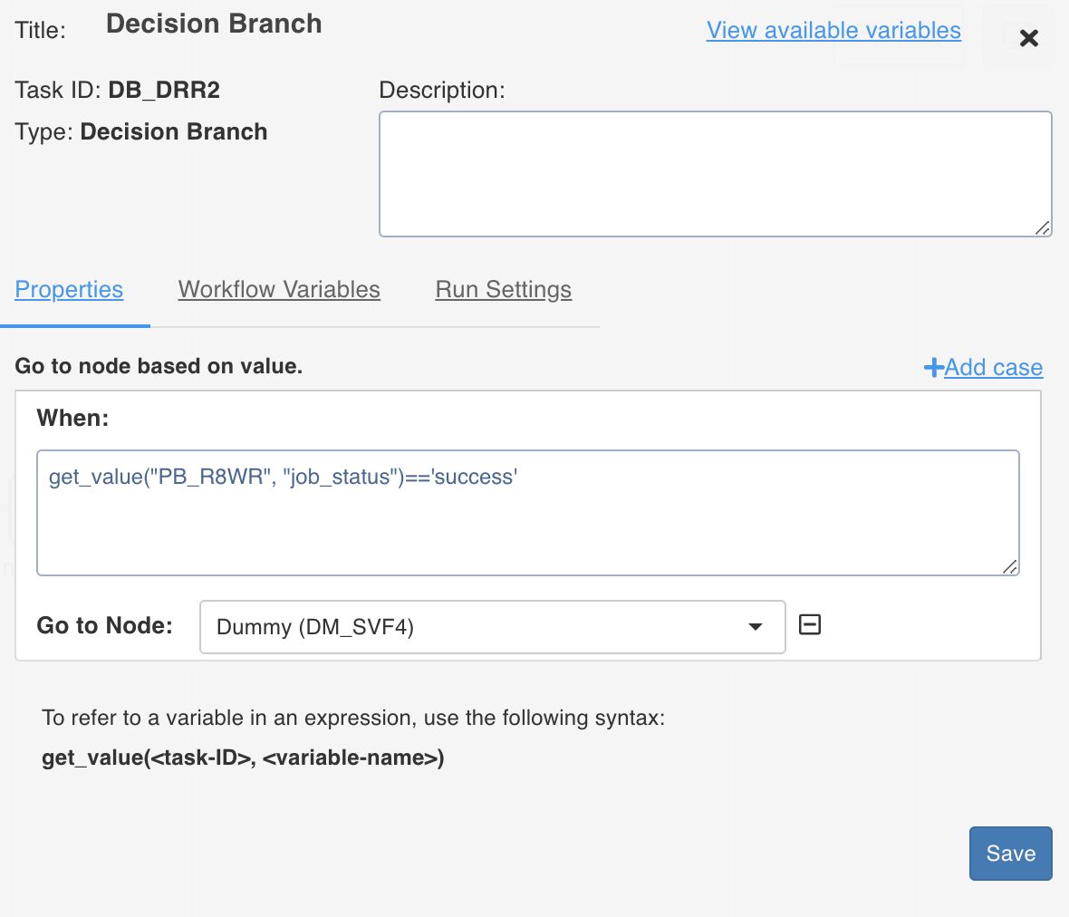 - View available variables: This option displays if a task has another preceding task connected to it.