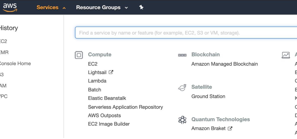 - Search for EC2 in Find Services in the AWS Console dashboard.