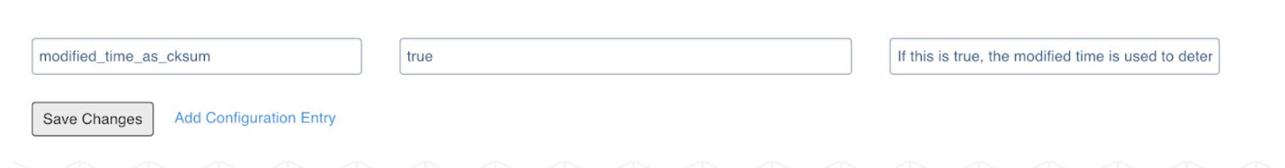 - In the Infoworks DataFoundry landing page, navigate to Admin > Configuration > Add Configuration Entry. Add property modified_time_as_cksum to True, and save it.