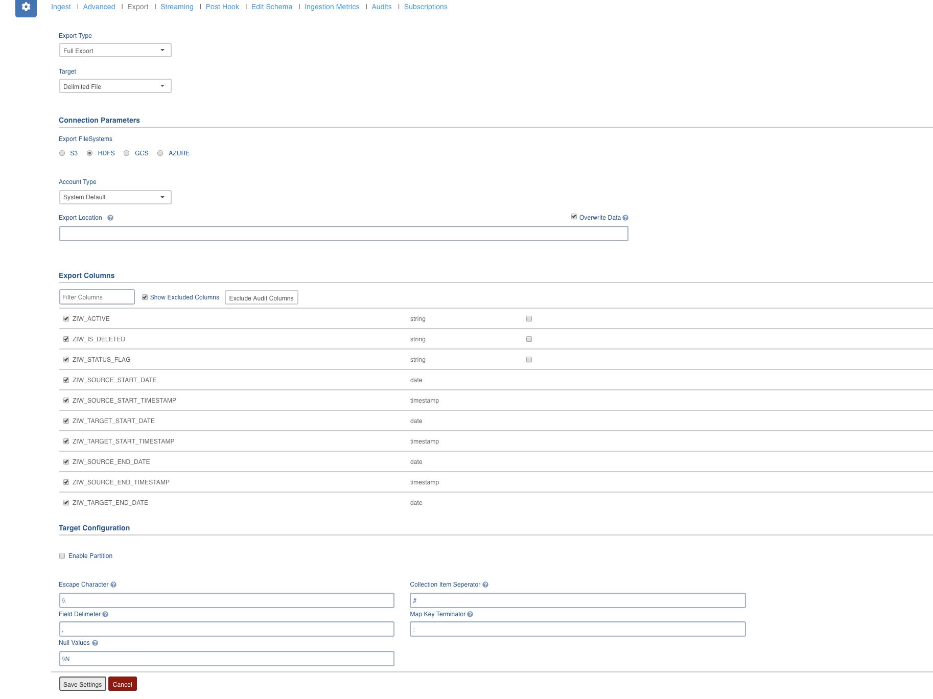 Export Location | Absolute URI of the location where data will be exported. In the Export Location field, ensure that all tables must have different export locations at a single point of time. |