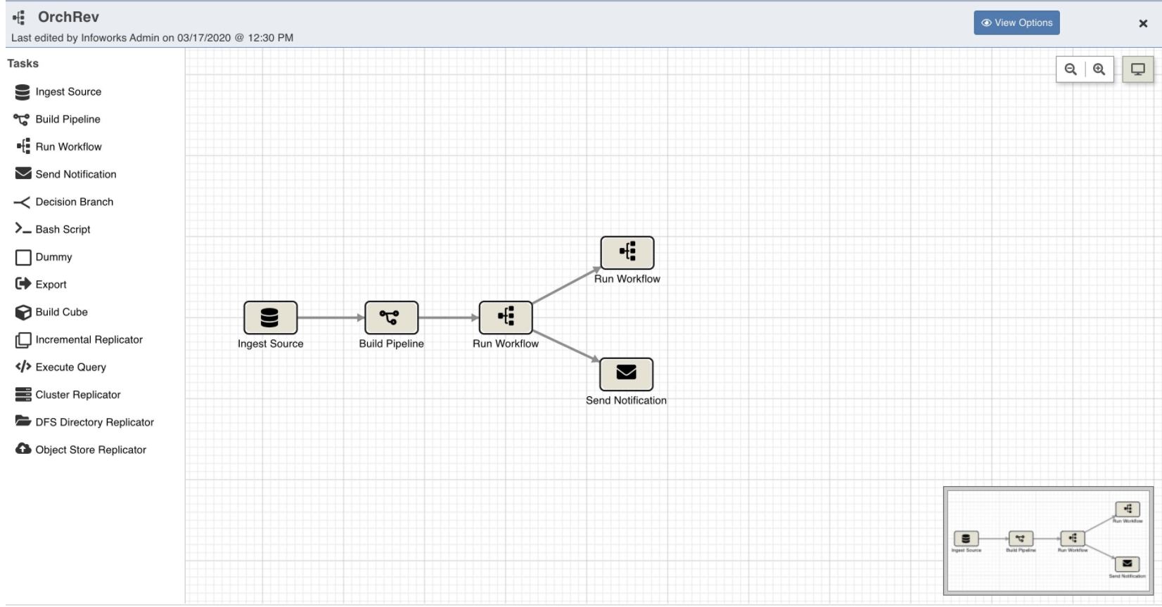 To find the Bash Script node on Infoworks, open the required workflow. The blank Workflow Preview page is displayed. Click Open Workflow Editor. The following editor is displayed with a set of available tasks under the Tasks section.