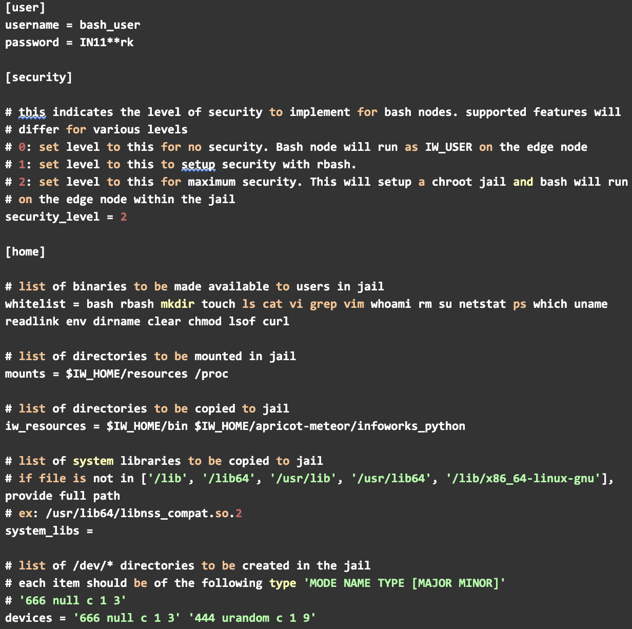 From the Infoworks edge node, admin can select the required security level, 0, 1 or 2, based on the scope and requirements of the internal users. The bash node allows only those allowed in this file, by the Infoworks admin with edge node access.