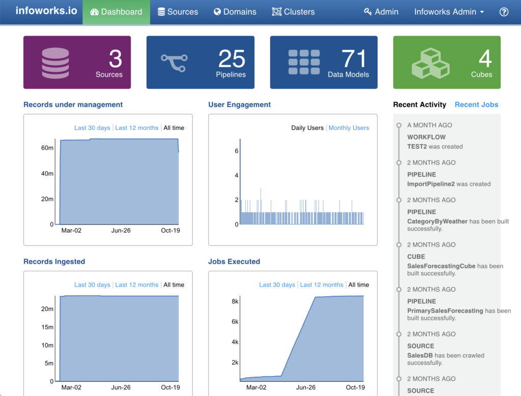 Infoworks provides an Executive Dashboard to view activities within the Infoworks environment.